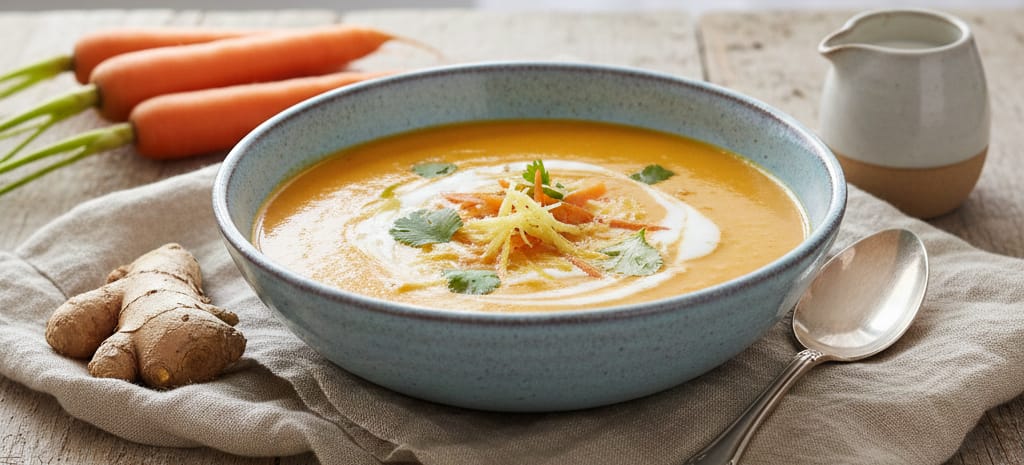 Pureed carrots blended with coconut milk and fresh ginger for a tasty vegan soup.