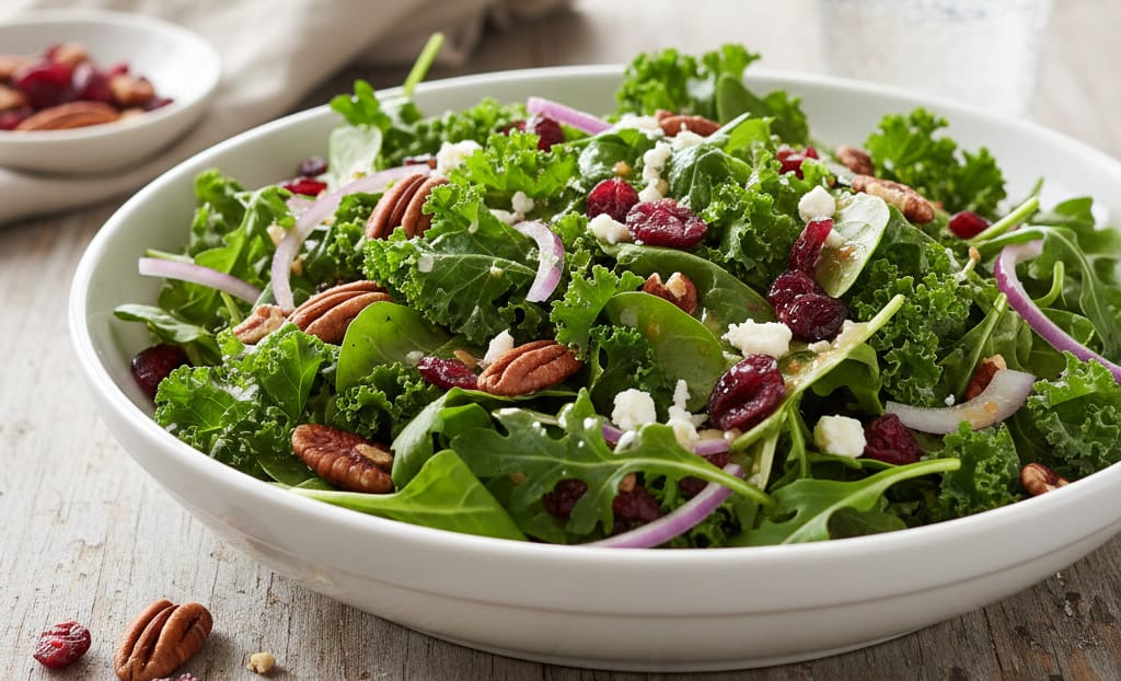 Salad: Dump bagged spring mix, dried cranberries, pecans, and bottled vinaigrette in a bowl.