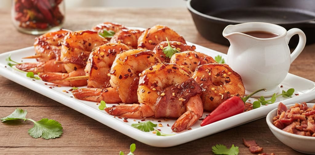 Sweet, smoky shrimp wrapped in crisp bacon with subtle heat.