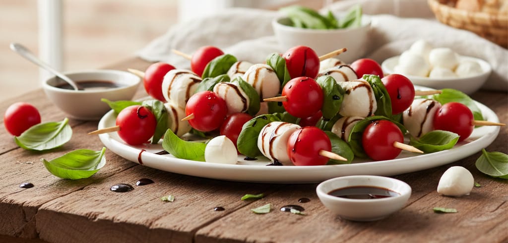 Fresh tomato, mozzarella, basil bites with balsamic drizzle.