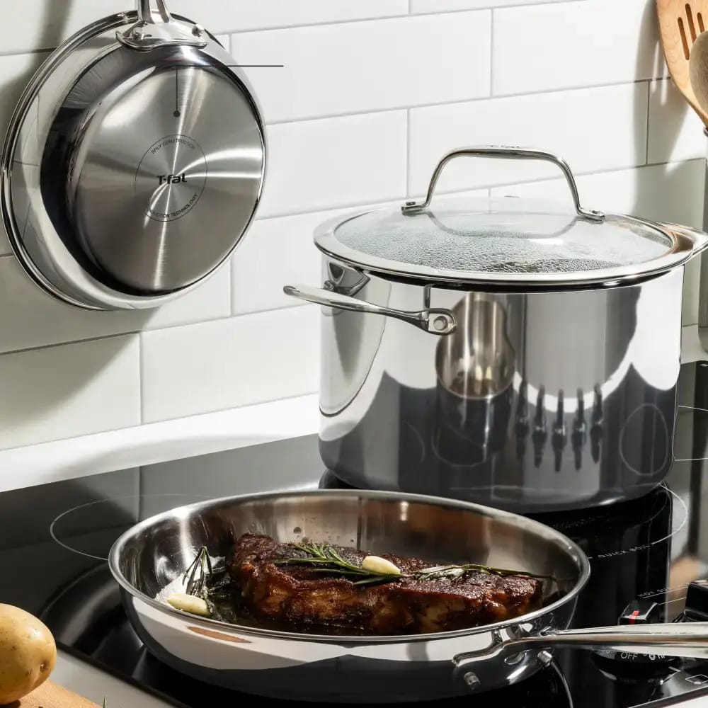 Stainless fry pan + sauté pan = high-heat sear, oven finish, sturdy handling.
