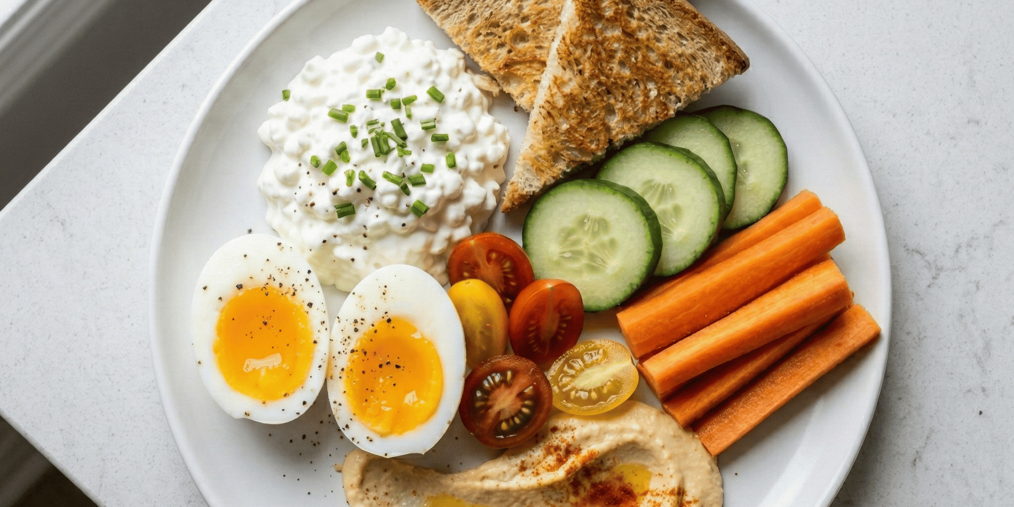 For my girlies out there, I’ve prepared the 10 minute girl dinner plate with cottage cheese, whole grain toast, cucumbers, cherry tomatoes, pickles, and hummus.