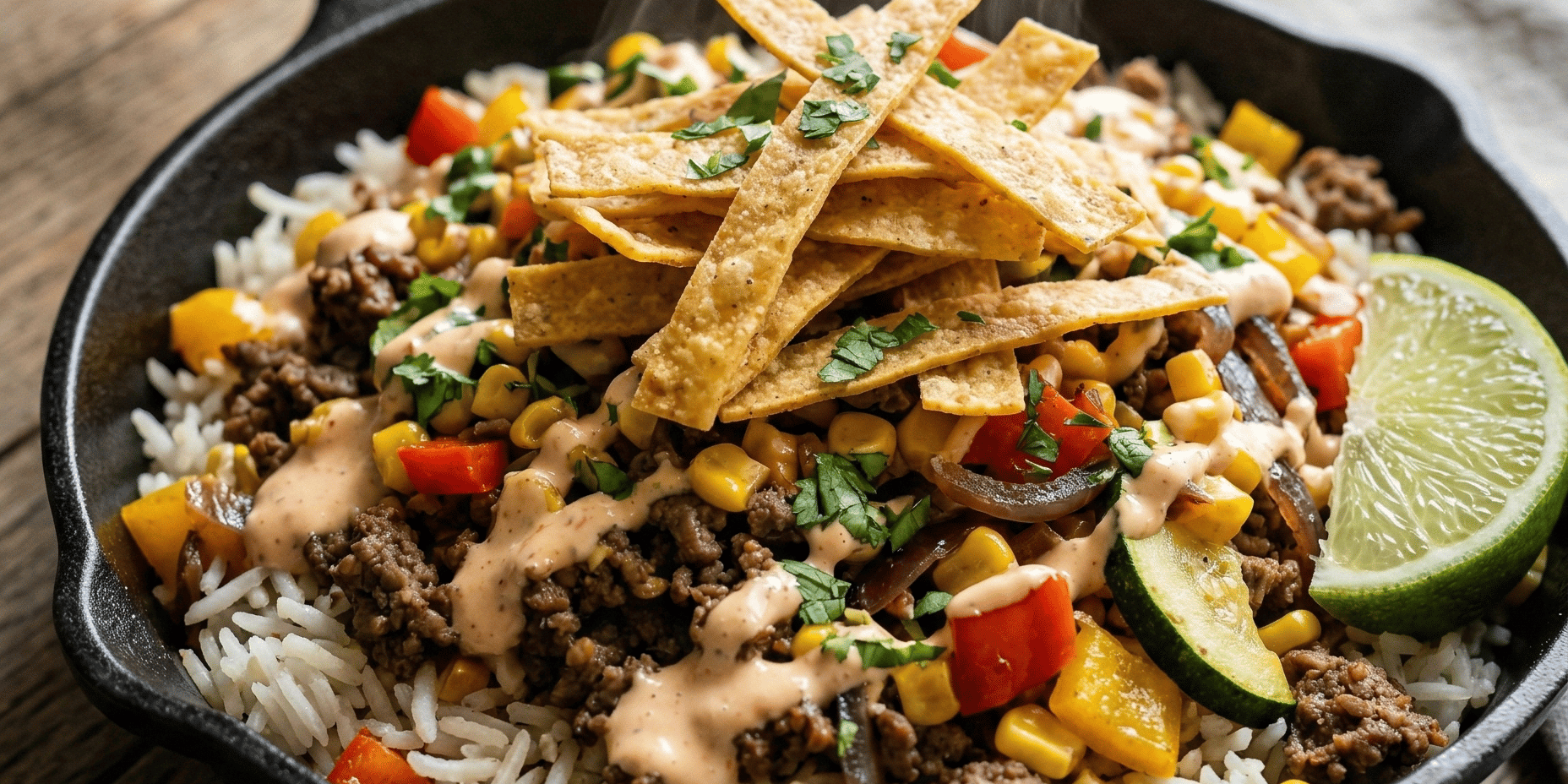 I’ve prepared the 25 minute skillet bowl version of boy kibble with seasoned ground turkey, rice, corn, bell peppers, salsa mixed with sour cream, and crushed tortilla chips for crunch.