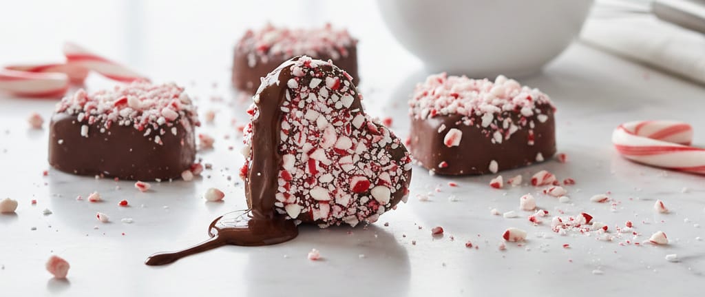 Melted chocolate hearts topped with crushed candy cane crunch.